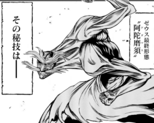 ギリシャ神話最高神とあって、最強の神に相応しい力を有している。あまりの速さに時間をも支配してしまう時を超える拳は、アダムでもなければ対応不可な必殺の一撃と思われるし、回避不能なスピードの拳をあり得ない量連打してくる最終形態阿陀磨須も頭がおかしい。アダムの能力ゆえに敗北寸前まで追い詰められたが、神の中でも最強のキャラだろう。S評価とした。
