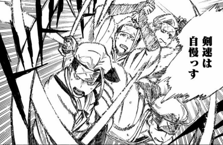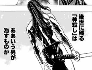 作中では「もう人の手に負える代物じゃない」と言われた巨大化朱槿を一刀に伏して行った。その所業は民谷は「後世に残る「神殺し」はああいう男が為すものか」と評価されるほど。