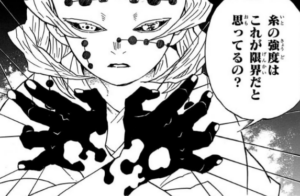 手から出した糸を自在に操る血鬼術を扱う。鋼鉄並みの硬度を誇り、相手を切り刻む鋭い刃にもなれば、日輪刀をも防ぐ盾にもなる攻防一体の能力となっている。並みの隊士であれば一瞬でバラバラに切り刻めるほどの鋭さを誇り、これを中距離から自由自在に飛ばしてくるので能力としてはかなり厄介。柱レベルでないと苦戦必至だろう。